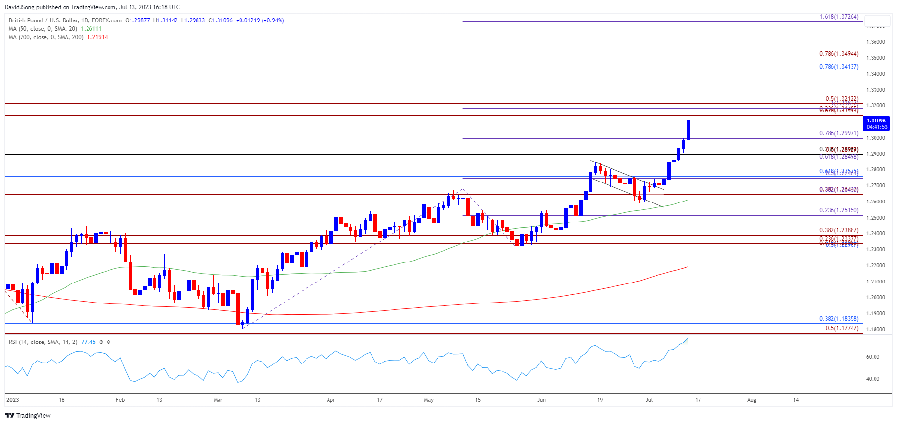 英镑/美元在7月份继续攀升至年内新高,继美国消费者物价指数(CPI)超预期放缓后延续涨势,而RSI升至70以上可能伴随着汇率的进一步上涨,就像2021年的价格走势一样。